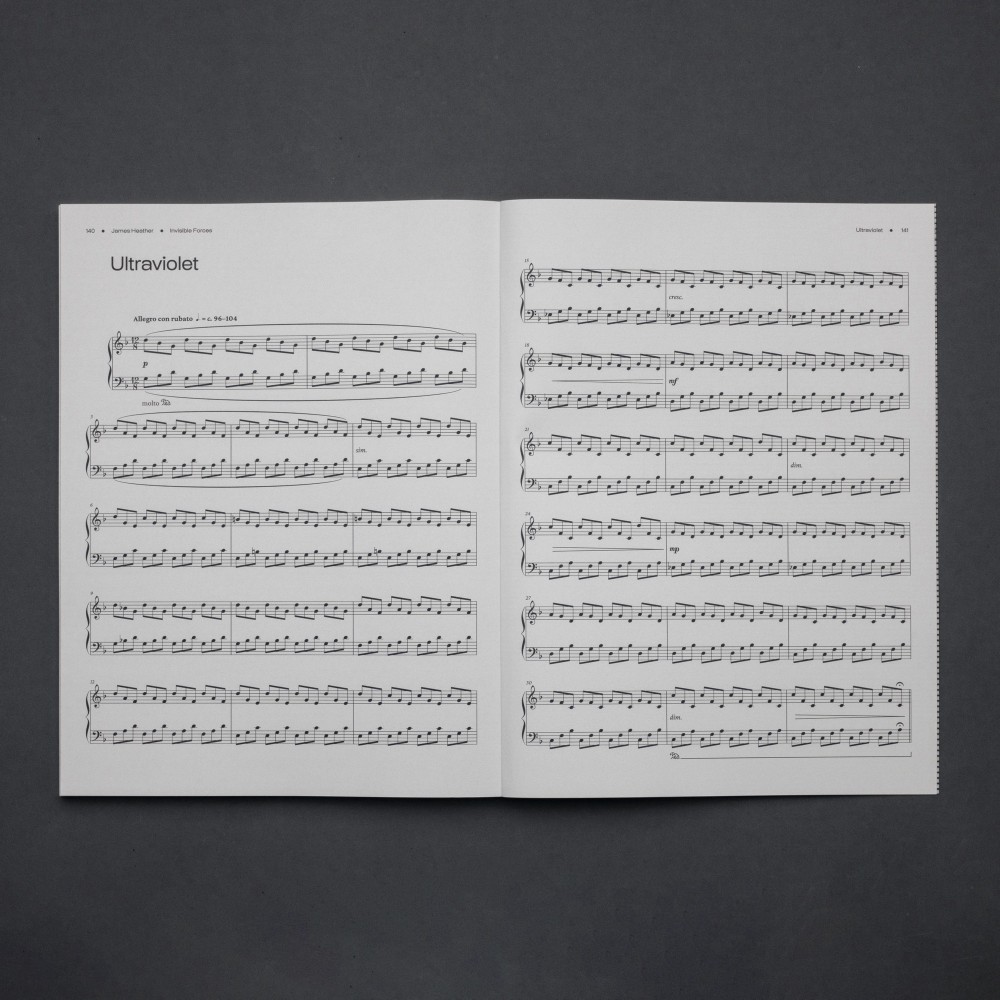Printed on 144 Munken Polar White Smooth 130gsm pages in an OTA Thread-sewn paperback featuring 25 works transcribed for the first time to sheet music by James Heather. Includes pieces such as “Ultraviolet”, “Empire Sounds”, “Biomes”, “Passing Soul”, and more, ranging from entry level to advanced difficulty. This printed collection hosts a written introduction alongside insightful performance notes from Heather. Exclusive art by SUKI is featured on Colorplan Ebony 270GSM cover with white foil blocking, as well as visualisations of pieces as spectrograms throughout the book's inner pages. |