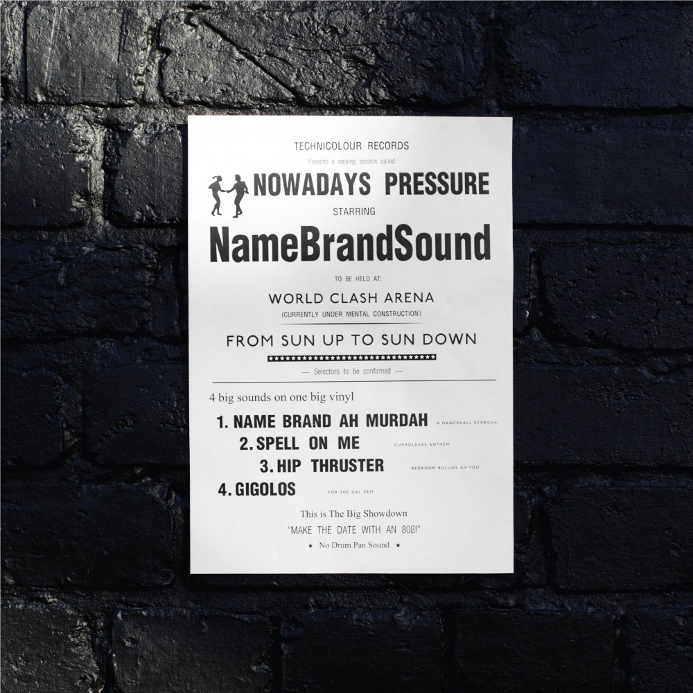 NameBrandSound’s music thus consists of the influences you might expect; dancehall, ‘80s soul, jungle, juke and house. What emerges, though, is more than the sum of its parts. Nowadays Pressure is a hugely refreshing, invigorated EP of electronic songs. Heavy and light, pummelling and caressing, emotive and tough, this is the sound of masters at work. The pair dub the sound ‘pressure;’ a rough meets smooth aesthetic that injects London’s bass music energy to the spirit of Metalheadz’ D’n’B-with-feeling and Massive Attack’s infectious mood.