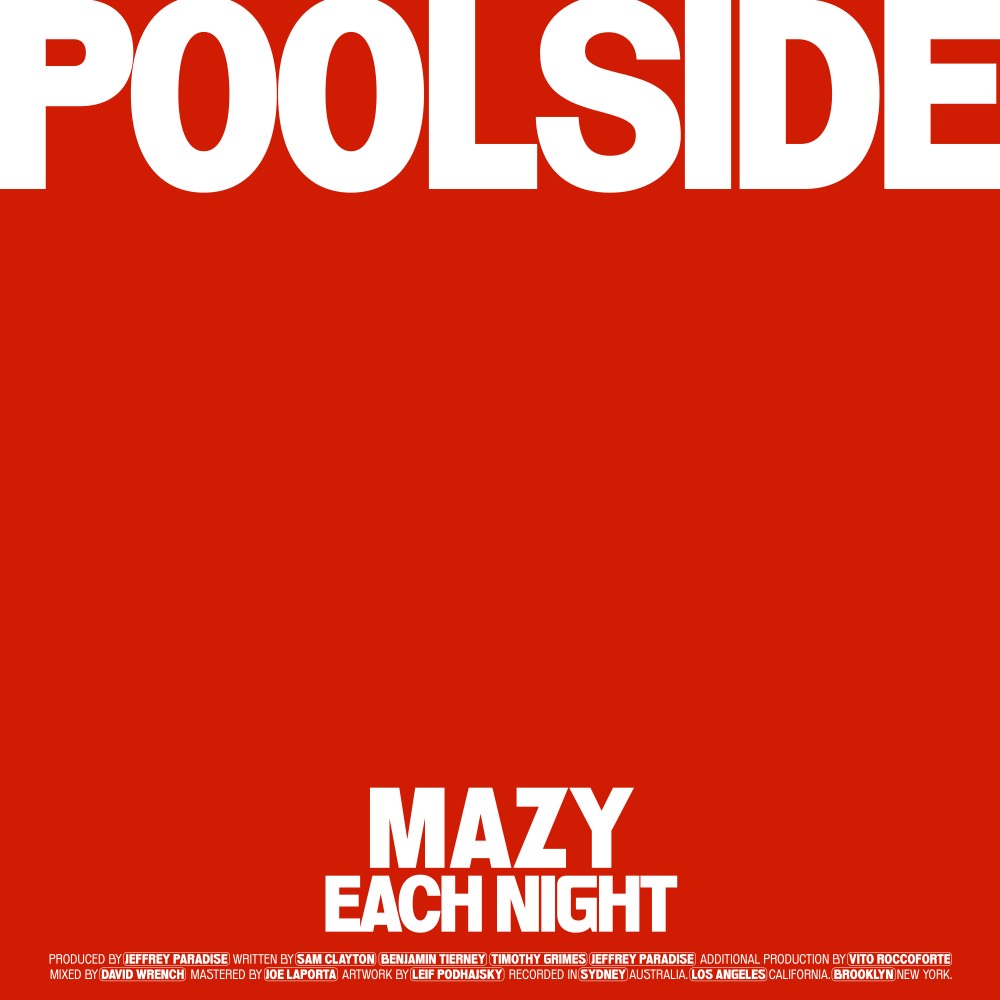 “‘Each Night' was written during the ending stages of a relationship,” shares collaborator Mazy. “I was always working late and didn't own a car, so I found myself running home to her through the empty streets in the dead of night. It is a song about realizing that something is coming to an end, but holding on to the joy and beauty of the way it was, not yet ready to let go. The song came together organically, we feel it captures the essence of offering your best at the beginning of creating something new and are honored to collaborate with Poolside, whose work we admire.”